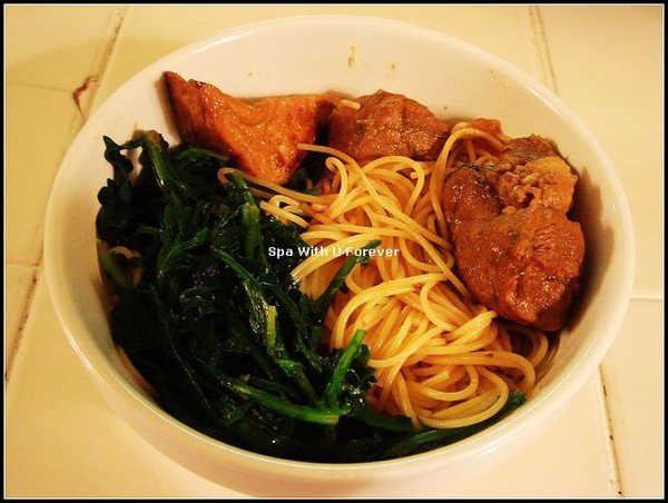 這一次我搭配紅燒肉油豆腐一起吃,均衡一下再燙一些日本茼蒿(我比較愛台灣茼蒿)一起吃。小眼也說,這樣弄很好吃。