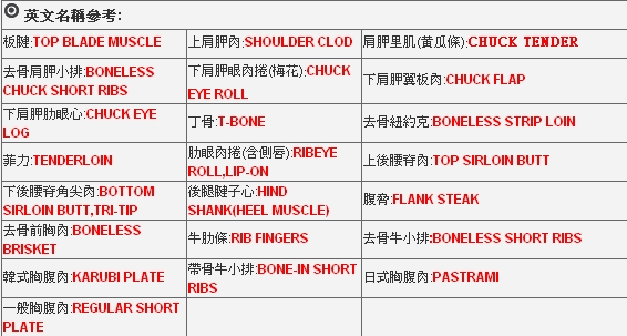 果然,在結帳時,那盒肉刷過去螢幕所顯示的物品是「雞翅」,而我們就這樣幸運地用雞翅的價格買到一盒牛肉,萬歲! 倒是連續煎了三次牛排後,我發現了一點異狀,就是這牛肉的口感還是不比我在台灣吃到的嫩,為何?雖說台灣COSTCO有賣PRIME級的牛小排,但我從沒買過,只買過CHOICE級,台灣美國我都是購買同樣等級,味道口感不應該差這麼多才是。 直到我估狗估狗再估狗,終於找到一個盲點,那就是我的牛小排多了一個字「chuck」,當我看到那個字時,尖叫,因為「chuck」屬於牛的頸肩,肉質較硬適合拿來燉煮,難怪,我這幾次都覺得肉質不嫩,甚至偏硬難以咀嚼,那是因為肉裡面筋太多,經過燉煮肉質才會變軟好吃。 唉!總歸一句,誤會一場。 因此我把剩下已分裝好丟在冷凍庫的牛小排,一包拿來做清燉牛肉湯(這次參考的食譜我不愛,等試到喜歡再分享),一份番茄牛肉麵,最後一份打算做泰式紅咖哩。 下次誰去台灣的COSTCO可以幫我注意一下牛小排的英文有沒有「chuck」嗎? 附註一:三本松國際農產品 http://spc-meat.com/about_beaf.html 就是這個網資料站讓我知道,差一個字,差真多!