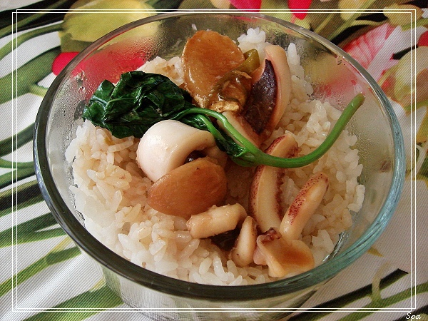 看阿基師示範 1.先將四塊雞臀肉(thigh)跑活水後清洗乾淨後切塊,並用熱水燙過去血水。我個人偏好用中火去血水,這樣雞肉可以慢慢跑出一些雜質,清得更乾淨,而且肉質也不會被燙硬。去血水後的雞肉用清水清洗乾淨,再用餐巾紙擦乾。 原本的步驟1太複雜,我改寫一下。 1.將四塊雞臀肉(chicken thigh)切塊放入冷水開小火慢慢煮,煮的時候會有一些雜質跑出來,煮約10-15分鐘看到水變不透明,雞肉表面也變色了,轉大火把雞肉煮滾一分鐘,熄火用水洗乾淨,盡量瀝乾。 2.中小火(電爐4號火力),鍋內加入香油與麻油(麻油多一些),油熱後加入蒜頭(完整6瓣)與薑片(6片)爆香,爆到蒜頭表面變黃薑片表面焦黃跑出香氣為止。(約10分鐘) 3.再加入蔥段(兩支蔥)和辣椒末(兩支會辣的小辣椒)繼續爆香。 4.炒香後,再加入雞肉(皮朝下),放置5分鐘後繼續翻炒。(這個時間可以準備步驟5的醬汁) 5.加入6大匙的酒、3大匙的醬油、2大匙的白砂糖和一點點麻油,煮滾後用小火悶煮。( 阿基師 建議 酒:醬油:糖=4:2:1) 6. 阿基師 說汁要煮到只剩一點點,但我煮大約20分鐘醬汁還是很多,我猜是我雞肉太少,哈,所以直接放入九層塔,蓋上鍋蓋悶一下,開動。 6.雞肉加蓋小火煮10分鐘,開蓋轉大火把湯汁收乾,最後加入九層塔即可。 小眼說,這次的 三杯雞 超正點,而且湯汁拿來拌飯很好吃,只可惜,我一開始爆香的麻油太多,後來混合醬汁的麻油也應該再少一些,畢竟雞肉也會出油。所以當我們雞肉吃完我把醬汁倒入保鮮盒放冷後,發現表面浮油很厚,驚,我剛剛可是淋很多醬汁拌飯呢!下次記得油可以再少一點,為了健康與身材。 為了讓三杯醬汁發揮最大的剩餘價值,我拿來做了三杯烏賊,先用一些醬汁表面的浮油炒香烏賊,再把剩餘醬汁倒入拌炒,小火煮到入味(約十分鐘),最後再丟九層塔增加香氣。 這碗三杯烏賊是我昨天中餐,剩下的給小眼帶便當。二手醬汁香氣沒有第一次濃郁,但味道還OK,而且我昨天嘗試吃一顆蒜頭,挖哩勒,蒜頭是甜的,而且軟軟的好好吃喔!