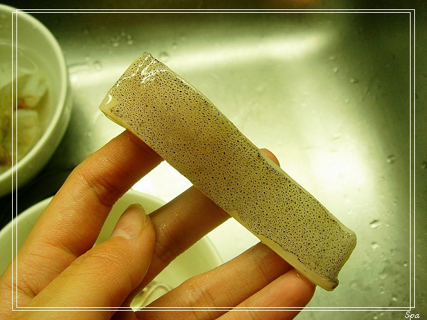 說到海鮮,在UT想吃到活跳跳的海鮮除了自己去湖裡釣最快,要不然只有大中超市有賣在魚缸游泳的魚蝦蟹,因此我吃的蝦和烏賊都是冷凍品,之前我在東南超市買過去皮的烏賊,整隻顏色白白而且被去頭,價格不貴,但煮幾次我常聞到消毒藥水味,而且浮沫很多。 後來我在東洋超市買到韓國人專做辣炒烏賊,切好片狀的冷凍烏賊,當初我看到圖片以為這烏賊切好花,越看越喜歡直接買一杯回家試做,只可惜我想太多,它沒有切花,但是每一片都切得很大片而且做菜沒有浮沫的問題,我很喜歡,雖然比較貴,但再購機率極高。